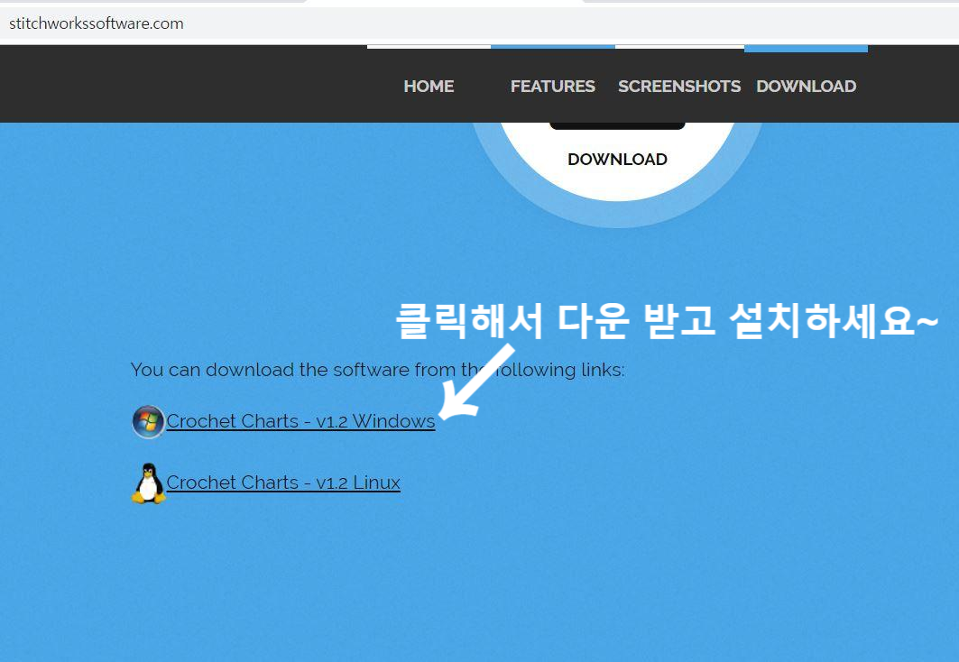 오른쪽 위에 있는 DOWNLOAD 클릭하고 화면 아래쪽에 Crochet Charts-v1.2 Windows 클릭해서 프로그램 다운 받고 설치하시면 코바늘 도안을 만들 수 있습니다.