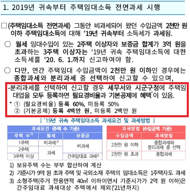 ++ 분리과세일 경우 필요경비율 60%와 기본공제 4백만 원을 받으려면 세무서와 시군구청에 각각 임대사업자로 등록하여야 합니다.