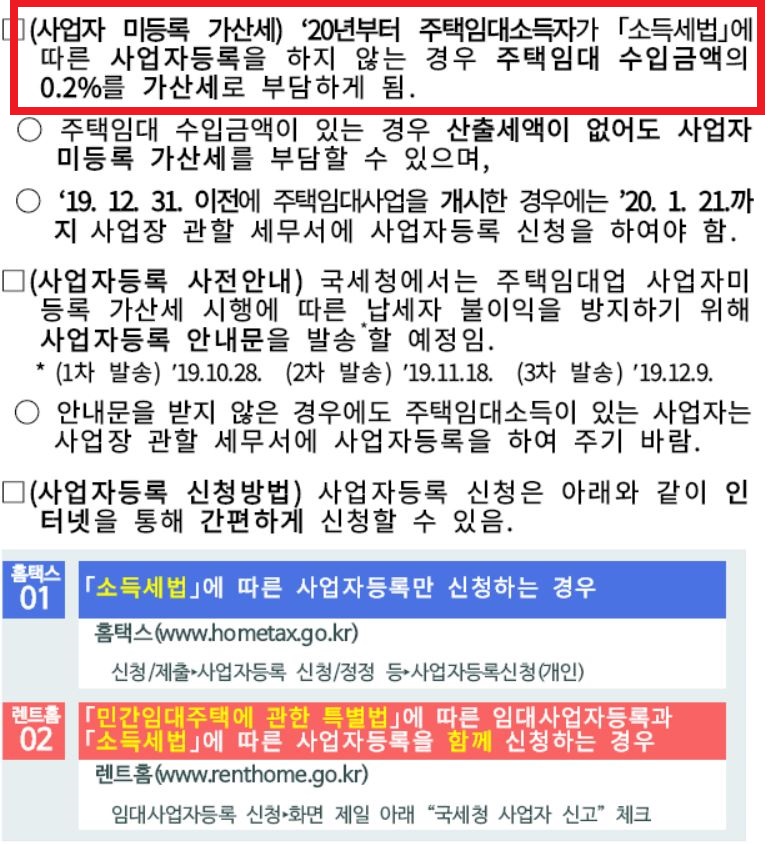 보도자료를 쭉 보시면 주택임대사업자로 등록하지 않는 임대인들에게 주택임대 수입금액의 0.2%의 미등록 가산세를 부과한다고 되어 있습니다.