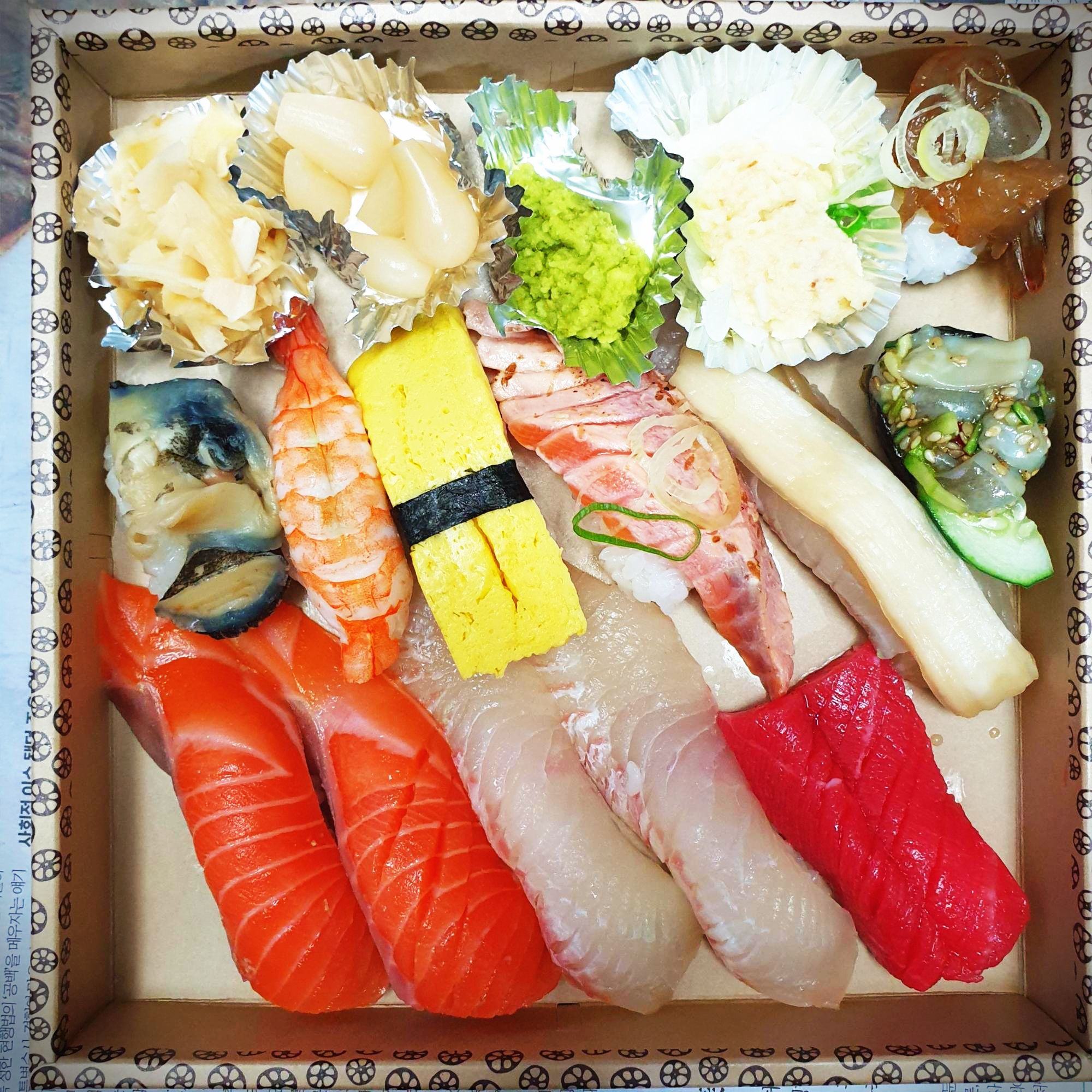 타코와사비, 조개살, 참치, 간장새우, 새우초밥, 연어 초밥.. 정말 맛있어요.