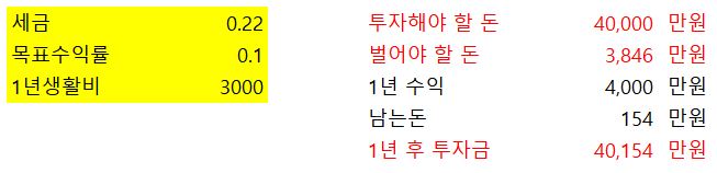 25,600만원을 투자하면 수익액에 대한 세금 22%를 내고 3,000만원의 생활비를 확보할 수 있다고 합니다.