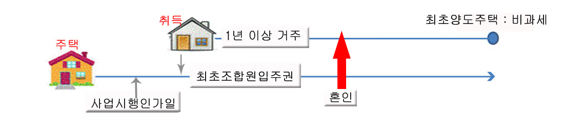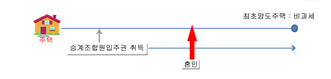 : A 또는 B가 가진 혼인전 조합원입주권이 매매 등으로 승계취득된 것인 경우, 이 조합원입주권을 취득하기 전부터 소유하던 주택을 혼인 후 먼저 양도하면 비과세 가능. (위의 그림②를 보세요)