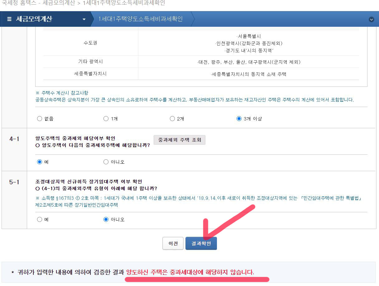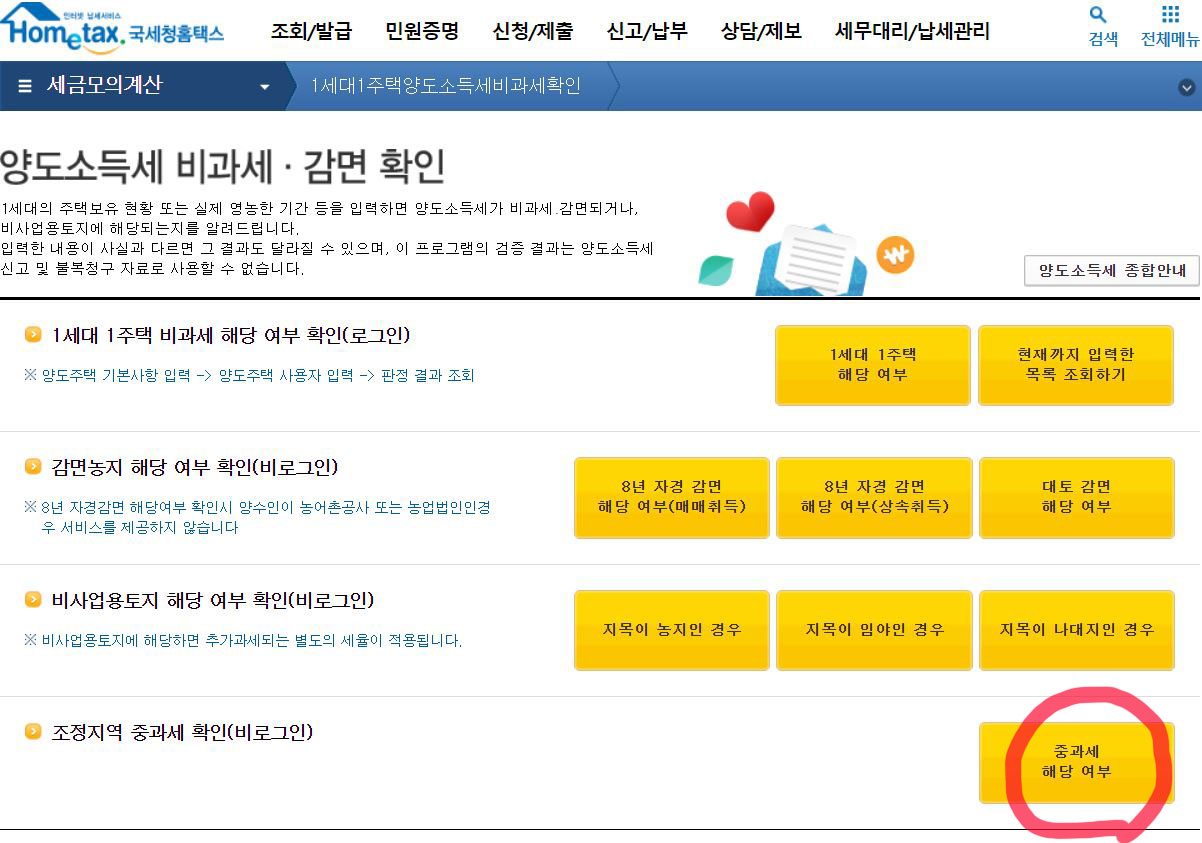 홈택스에서 양도하려는 주택이 양도세 중과 배제 주택인지 확인할 수 있습니다.