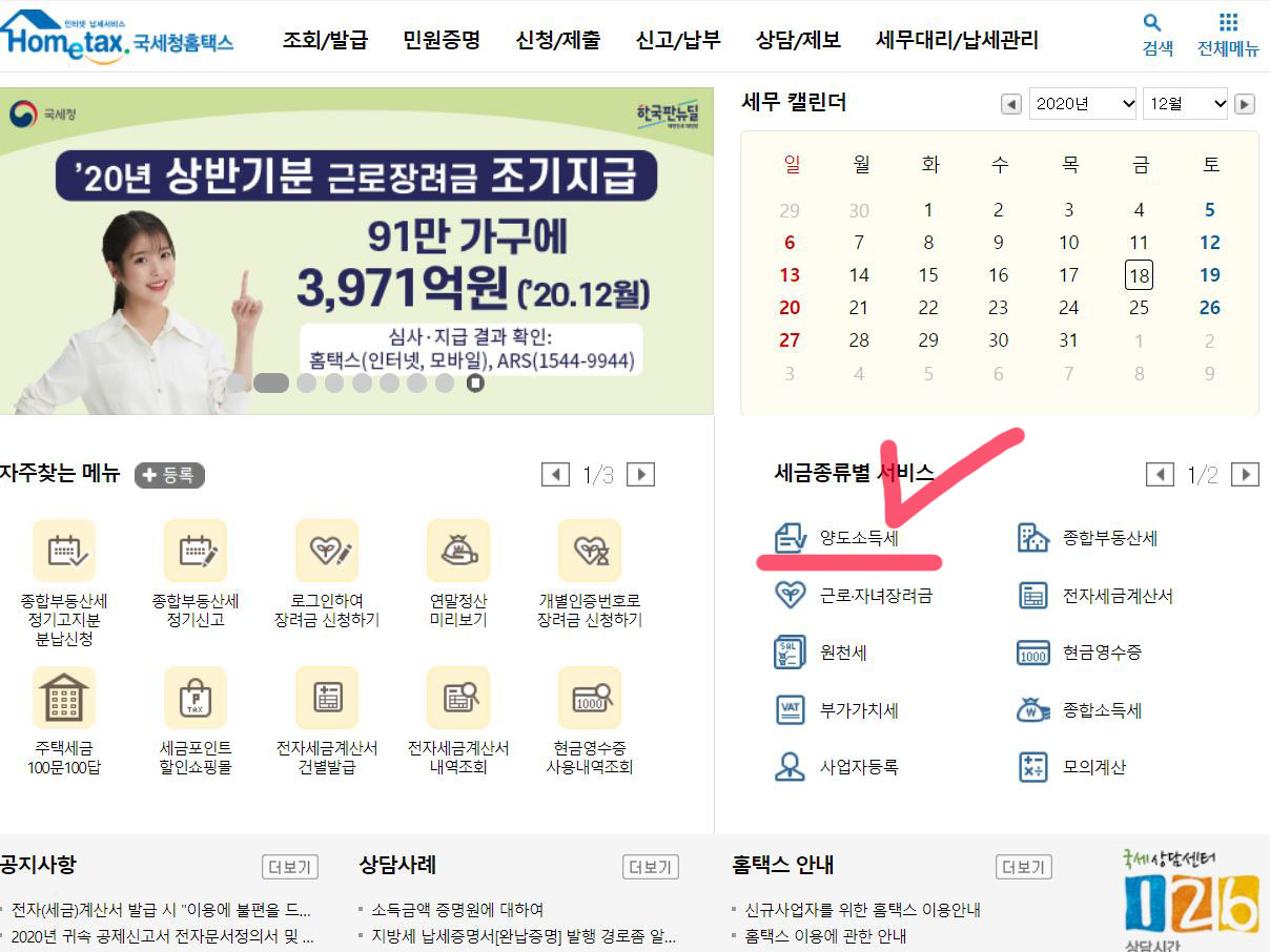 아래의 화면에서 [양도소득세] 클릭합니다.
