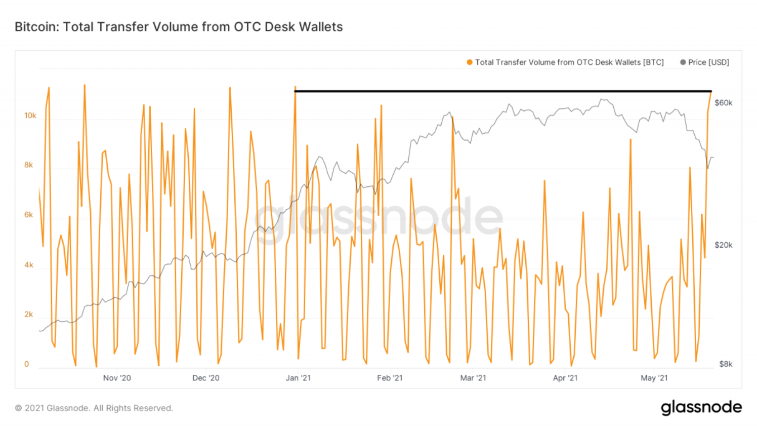 장외거래(OTC) 데스크와 연동된 지갑은 비트코인이 4만3000달러에서 3만 달러 가까이 폭락한 5월19일, 1만292BTC의 유출을 등록했습니다. Glassnode에 따르면, 이것은 지난 3.5개월만에 OTC에서 하루 동안 가장 많이 유출된 것이라고 하구요.