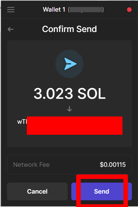 5. 입금주소와 수량을 확인하고 이상 없으면 "Send" 버튼 클릭합니다.