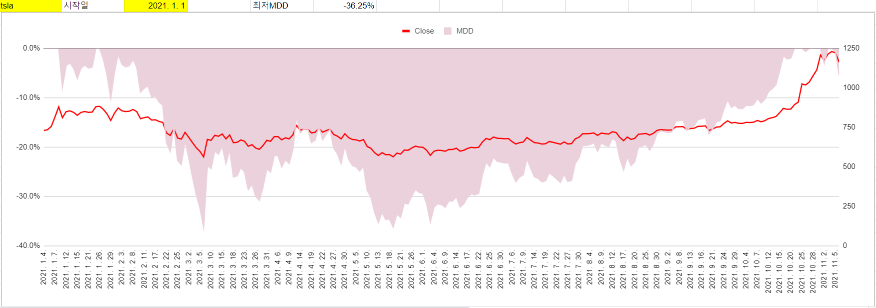 2021년1월1일부터 최근까지를 조회했더니, 최대 MDD가 tqqq는 -30.43%, 테슬라는 -36.25% 예요.