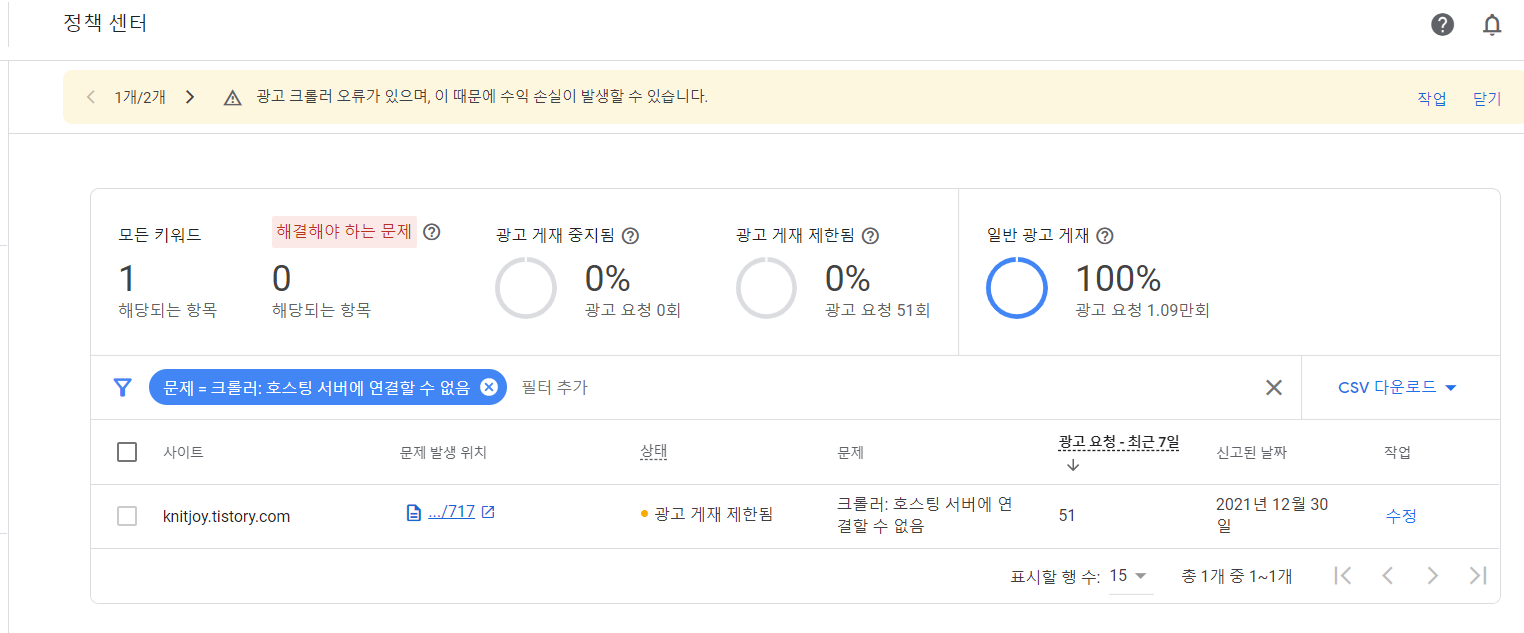 "광고 크롤러 오류가 있으며, 이 때문에 수익 손실이 발생할 수 있습니다." 라는 메세지가 떴습니다.