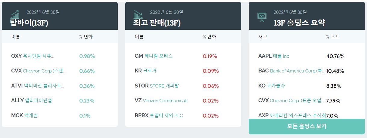 전설적인 억만장자 투자자인 워렌 버핏이 운영하는 버크셔 해서웨이가 2022년 2분기에 대해 보고 한 주식 보유 및 매매 현황입니다.