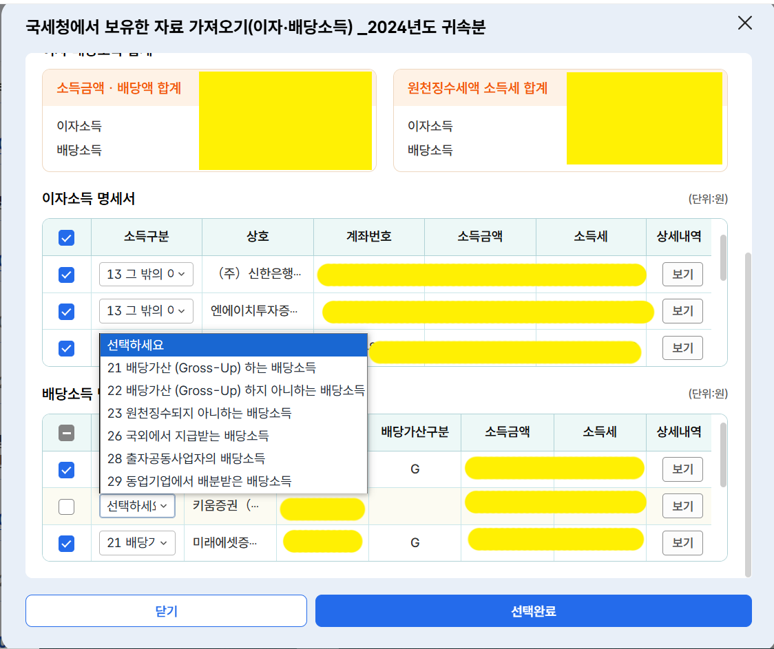 홈택스에서 이자소득을 입력할 때 소득 구분은 ‘그 밖의 이자소득’을 선택합니다.
