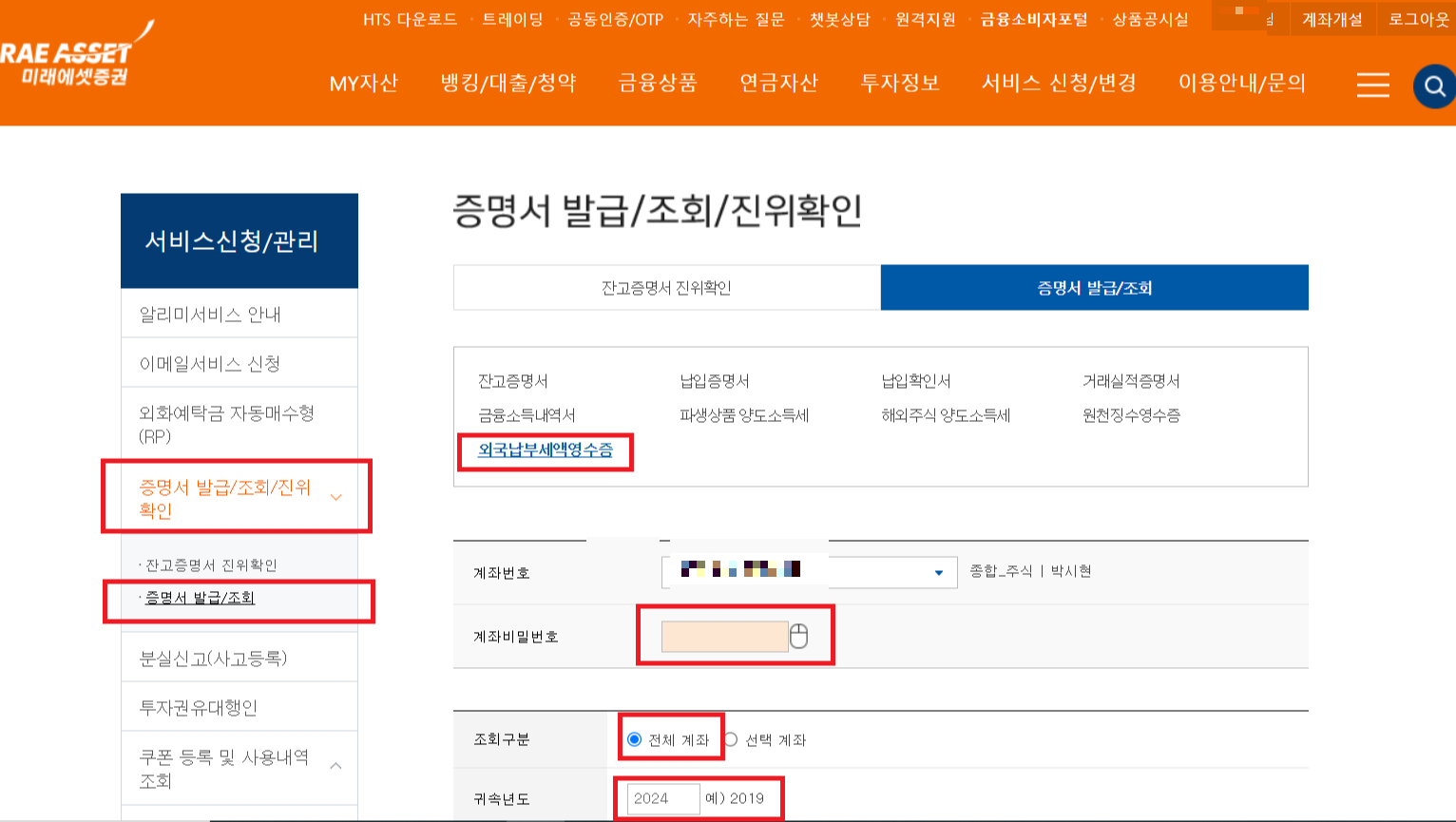 미래에셋 홈페이지 -> 서비스 신청/변경 -> 서비스신청/관리-> 증명서 발급/조회/진위확인-> 증명서 발급
